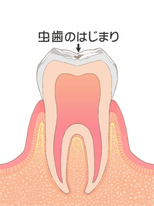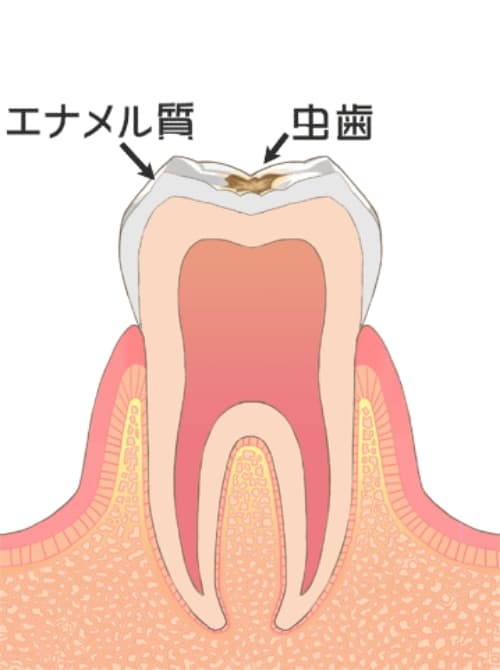 歯の表面にあるエナメル質が、むし歯菌が出す酸に溶かされている状態です。この段階でも削らずに経過観察とする場合もありますが、多くのケースで悪い部分を削って詰め物で対応することが一般的です。