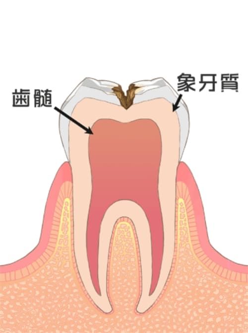 エナメル質の内側にある象牙質まで浸食されています。象牙質の内側には神経があるので、温度の刺激を受けやすくなる知覚過敏が起きることもあります。悪い部分を削って詰め物で対応することが一般的です。
