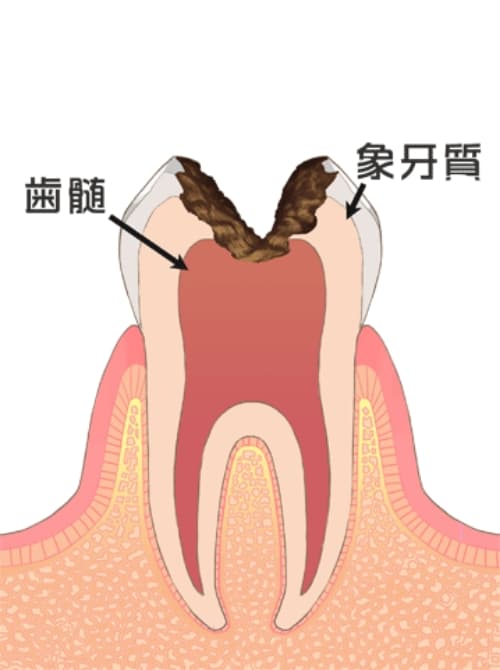 象牙質に穴が開いて神経にも感染が起こっています。激しい痛みを伴う場合がありますし、歯の根に膿が溜まると口臭がきつくなります。この場合、根管治療で歯の根の感染を除去し、薬剤を詰めて被せ物でカバーします。