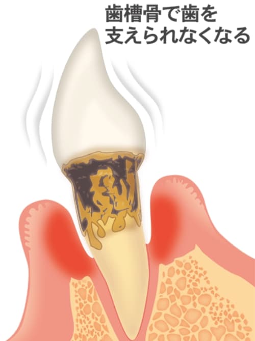 重度の歯周炎では、歯槽骨の大部分が失われ、歯を支える機能が著しく低下します。歯のグラつきが顕著になり、歯肉から膿が出てくるケースもあります。この段階では、歯を保存することが困難です。抜歯を検討し、抜歯後は、欠損部の機能回復のために、インプラントや入れ歯などの補綴治療が必要になります。