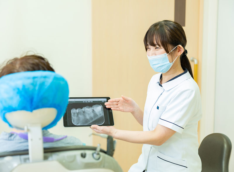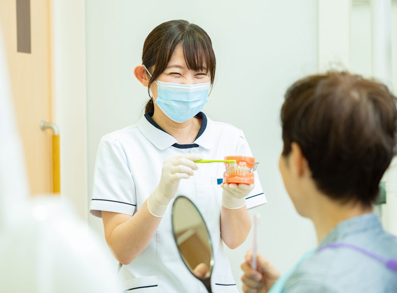 むし歯や歯周病の予防に習熟した歯科衛生士が、ホームケアの指導を行います。噛み合わせや歯並び、磨き方の癖など、患者さま固有の状況を踏まえてブラッシングやケアの方法を丁寧にレクチャーします。